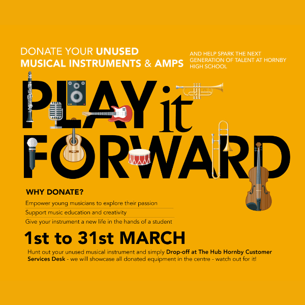 Donated musical instruments can be dropped off at The Hub Hornby Customer Services Desk.
