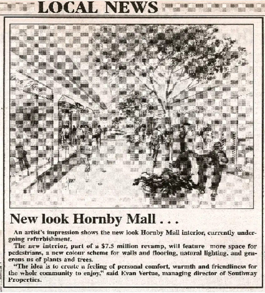 This project was completed through a University of Canterbury Arts Internship. All photographs and information were collected from people who have been involved with the mall for many years or came from the Hub Hornby’s historical archive.
